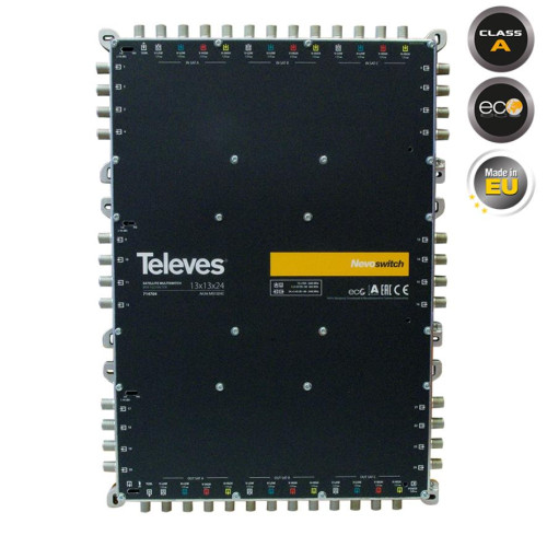 714704 NEVOSWITCH 13x13x24 belongs to a new range of input/multiple output switches. NEVOSWITCH 13 is a range of 13 input multiswitches (12 satellite polarities + Freeview). Expand the number of users by cascading two or more units. Small and compact design to provide an easy and quick installation. The range includes a 13x line amplifier with 25 dB average gain for Satellite inputs and 27 dB gain for Terrestrial with DC pass. 75 ohms switch included to load the unit (standalone) or not (cascade configurations). Highlights: Radiation inmune thanks to its zamak made chassis. All switch references are valid for standalone, star or cascade configuration. Selectable IF gain (+10 dB) for each group or 16 users to balance the output signals. Multiple powering options: mains and line powered. ECO mode: the overall consumption is reduced as the number of users decreases. Main features:Use the same multiswitch in either star/cascade or standalone configuration. Small sized design: Make the most of space to accomodate more TV subscribers.